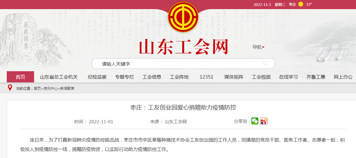 媒體聚焦 | 山東工會(huì)網(wǎng):市中區(qū)草莓種植技術(shù)協(xié)會(huì)工友創(chuàng)業(yè)園愛心捐贈(zèng)助力疫情防控